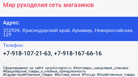 Мир рукоделия, сеть магазинов по адресу 352924, Краснодарский край, Армавир, Новороссийская, 129 в дальнейшем Организация, размещена в следующих категориях: