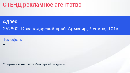 СТЕНД, рекламное агентство по адресу 352900, Краснодарский край, Армавир, Ленина, 101а в дальнейшем Организация, размещена в следующих категориях: