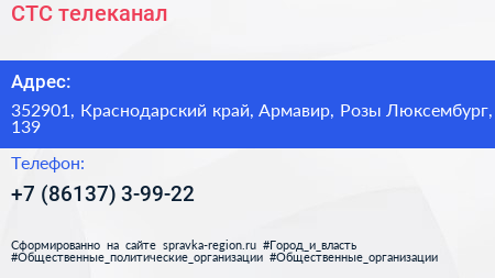 СТС, телеканал по адресу 352901, Краснодарский край, Армавир, Розы Люксембург, 139 в дальнейшем Организация, размещена в следующих категориях: