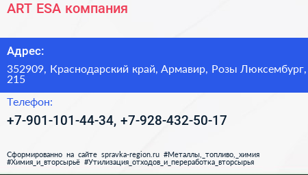 ART-ESA, компания по адресу 352909, Краснодарский край, Армавир, Розы Люксембург, 215 в дальнейшем Организация, размещена в следующих категориях: