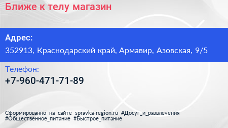 Ближе к телу, магазин по адресу 352913, Краснодарский край, Армавир, Азовская, 9/5 в дальнейшем Организация, размещена в следующих категориях: