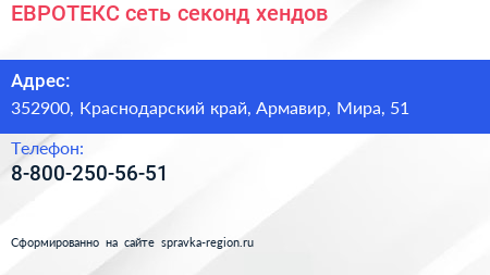 ЕВРОТЕКС, сеть секонд-хендов по адресу 352900, Краснодарский край, Армавир, Мира, 51 в дальнейшем Организация, размещена в следующих категориях: