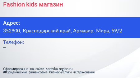 Fashion kids, магазин по адресу 352900, Краснодарский край, Армавир, Мира, 59/2 в дальнейшем Организация, размещена в следующих категориях: