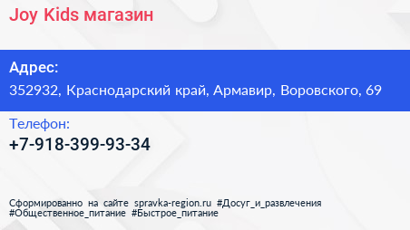 Joy Kids, магазин по адресу 352932, Краснодарский край, Армавир, Воровского, 69 в дальнейшем Организация, размещена в следующих категориях: