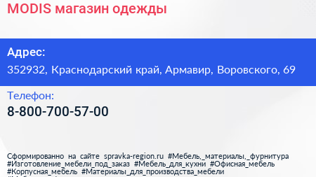MODIS, магазин одежды по адресу 352932, Краснодарский край, Армавир, Воровского, 69 в дальнейшем Организация, размещена в следующих категориях: