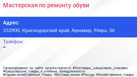 Мастерская по ремонту обуви по адресу 352900, Краснодарский край, Армавир, Мира, 36 в дальнейшем Организация, размещена в следующих категориях: