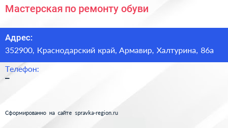 Мастерская по ремонту обуви по адресу 352900, Краснодарский край, Армавир, Халтурина, 86а в дальнейшем Организация, размещена в следующих категориях: