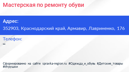Мастерская по ремонту обуви по адресу 352903, Краснодарский край, Армавир, Лавриненко, 176 в дальнейшем Организация, размещена в следующих категориях: