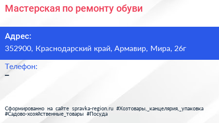 Мастерская по ремонту обуви по адресу 352900, Краснодарский край, Армавир, Мира, 26г в дальнейшем Организация, размещена в следующих категориях: