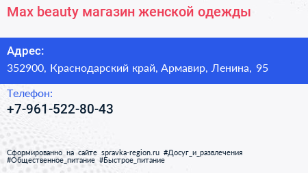 Max beauty, магазин женской одежды по адресу 352900, Краснодарский край, Армавир, Ленина, 95 в дальнейшем Организация, размещена в следующих категориях: