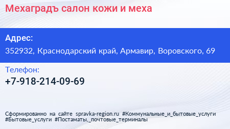 Мехаградъ, салон кожи и меха по адресу 352932, Краснодарский край, Армавир, Воровского, 69 в дальнейшем Организация, размещена в следующих категориях: