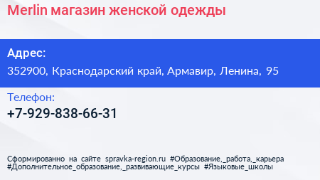 Merlin, магазин женской одежды по адресу 352900, Краснодарский край, Армавир, Ленина, 95 в дальнейшем Организация, размещена в следующих категориях: