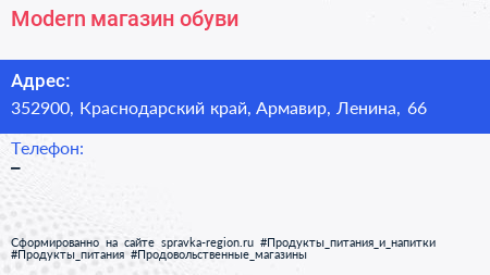 Modern, магазин обуви по адресу 352900, Краснодарский край, Армавир, Ленина, 66 в дальнейшем Организация, размещена в следующих категориях: