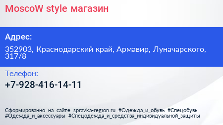 MoscoW style, магазин по адресу 352903, Краснодарский край, Армавир, Луначарского, 317/8 в дальнейшем Организация, размещена в следующих категориях: