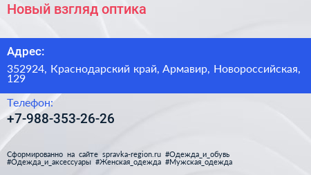 Новый взгляд, оптика по адресу 352924, Краснодарский край, Армавир, Новороссийская, 129 в дальнейшем Организация, размещена в следующих категориях: