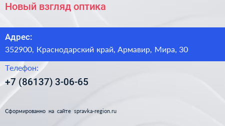 Новый взгляд, оптика по адресу 352900, Краснодарский край, Армавир, Мира, 30 в дальнейшем Организация, размещена в следующих категориях: