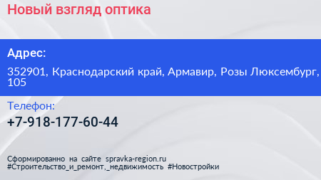 Новый взгляд, оптика по адресу 352901, Краснодарский край, Армавир, Розы Люксембург, 105 в дальнейшем Организация, размещена в следующих категориях: