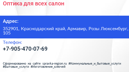 Оптика для всех, салон по адресу 352901, Краснодарский край, Армавир, Розы Люксембург, 105 в дальнейшем Организация, размещена в следующих категориях: