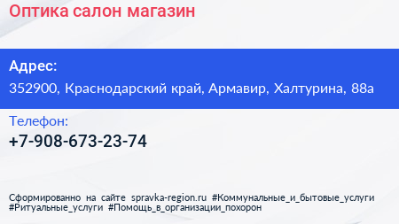 Оптика, салон-магазин по адресу 352900, Краснодарский край, Армавир, Халтурина, 88а в дальнейшем Организация, размещена в следующих категориях: