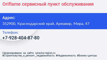 Oriflame, сервисный пункт обслуживания по адресу 352900, Краснодарский край, Армавир, Мира, 47 в дальнейшем Организация, размещена в следующих категориях: