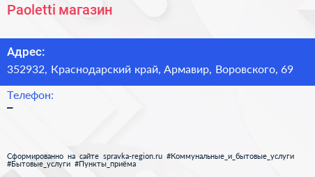 Paoletti, магазин по адресу 352932, Краснодарский край, Армавир, Воровского, 69 в дальнейшем Организация, размещена в следующих категориях: