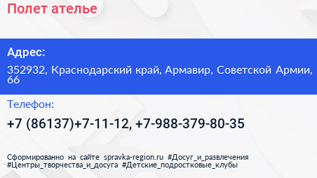 Полет, ателье по адресу 352932, Краснодарский край, Армавир, Советской Армии, 66 в дальнейшем Организация, размещена в следующих категориях: