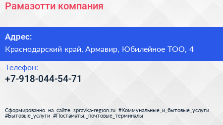 Рамазотти, компания по адресу Краснодарский край, Армавир, Юбилейное ТОО, 4 в дальнейшем Организация, размещена в следующих категориях: