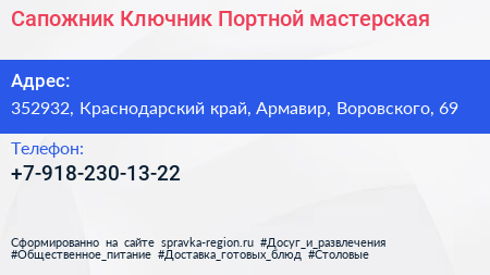 Сапожник. Ключник. Портной, мастерская по адресу 352932, Краснодарский край, Армавир, Воровского, 69 в дальнейшем Организация, размещена в следующих категориях: