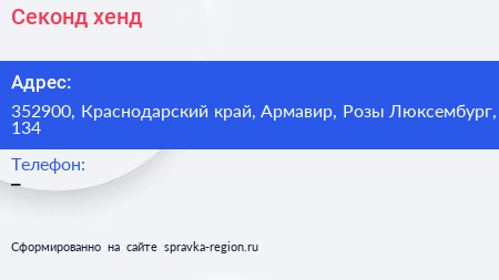 Секонд-хенд по адресу 352900, Краснодарский край, Армавир, Розы Люксембург, 134 в дальнейшем Организация, размещена в следующих категориях:
