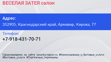 ВЕСЕЛАЯ ЗАТЕЯ, салон по адресу 352905, Краснодарский край, Армавир, Кирова, 77 в дальнейшем Организация, размещена в следующих категориях: