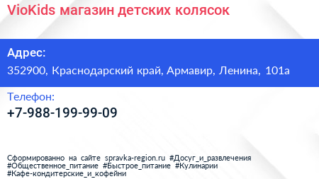 VioKids, магазин детских колясок по адресу 352900, Краснодарский край, Армавир, Ленина, 101а в дальнейшем Организация, размещена в следующих категориях:
