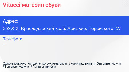Vitacci, магазин обуви по адресу 352932, Краснодарский край, Армавир, Воровского, 69 в дальнейшем Организация, размещена в следующих категориях: