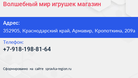 Волшебный мир игрушек, магазин по адресу 352905, Краснодарский край, Армавир, Кропоткина, 209а в дальнейшем Организация, размещена в следующих категориях: