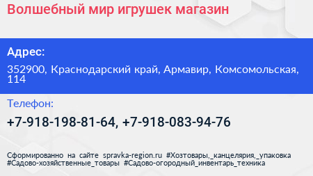 Волшебный мир игрушек, магазин по адресу 352900, Краснодарский край, Армавир, Комсомольская, 114 в дальнейшем Организация, размещена в следующих категориях: