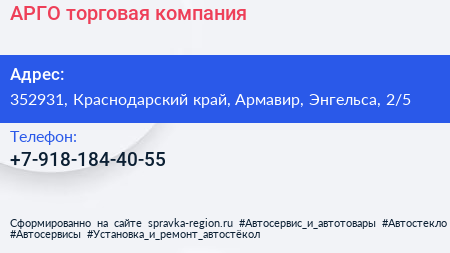 АРГО, торговая компания по адресу 352931, Краснодарский край, Армавир, Энгельса, 2/5 в дальнейшем Организация, размещена в следующих категориях: