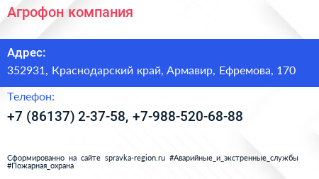 Агрофон, компания по адресу 352931, Краснодарский край, Армавир, Ефремова, 170 в дальнейшем Организация, размещена в следующих категориях: