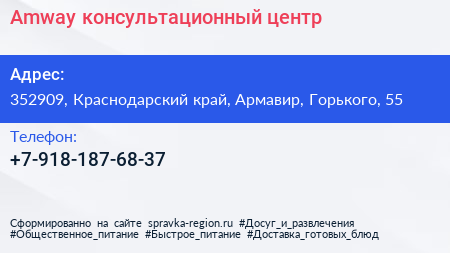 Amway, консультационный центр по адресу 352909, Краснодарский край, Армавир, Горького, 55 в дальнейшем Организация, размещена в следующих категориях: