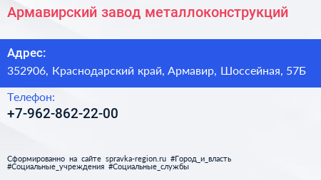 Армавирский завод металлоконструкций по адресу 352906, Краснодарский край, Армавир, Шоссейная, 57Б в дальнейшем Организация, размещена в следующих категориях: