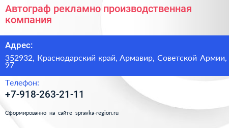 Автограф, рекламно-производственная компания по адресу 352932, Краснодарский край, Армавир, Советской Армии, 97 в дальнейшем Организация, размещена в следующих категориях: