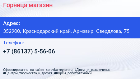 Горница, магазин по адресу 352900, Краснодарский край, Армавир, Свердлова, 75 в дальнейшем Организация, размещена в следующих категориях: