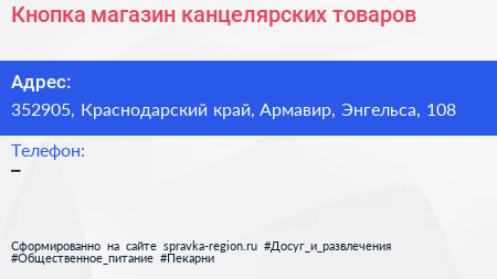 Кнопка, магазин канцелярских товаров по адресу 352905, Краснодарский край, Армавир, Энгельса, 108 в дальнейшем Организация, размещена в следующих категориях: