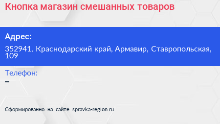 Кнопка, магазин смешанных товаров по адресу 352941, Краснодарский край, Армавир, Ставропольская, 109 в дальнейшем Организация, размещена в следующих категориях: