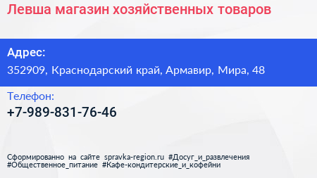 Левша, магазин хозяйственных товаров по адресу 352909, Краснодарский край, Армавир, Мира, 48 в дальнейшем Организация, размещена в следующих категориях: