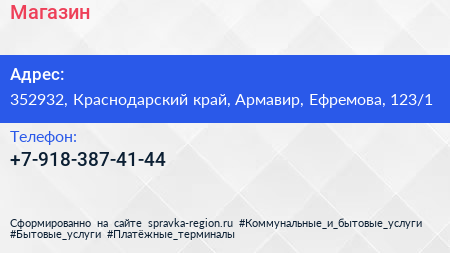 Магазин по адресу 352932, Краснодарский край, Армавир, Ефремова, 123/1 в дальнейшем Организация, размещена в следующих категориях: