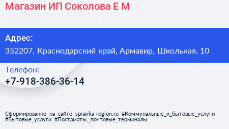 Магазин, ИП Соколова Е.М. по адресу 352207, Краснодарский край, Армавир, Школьная, 10 в дальнейшем Организация, размещена в следующих категориях: