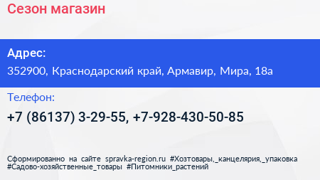 Сезон, магазин по адресу 352900, Краснодарский край, Армавир, Мира, 18а в дальнейшем Организация, размещена в следующих категориях: