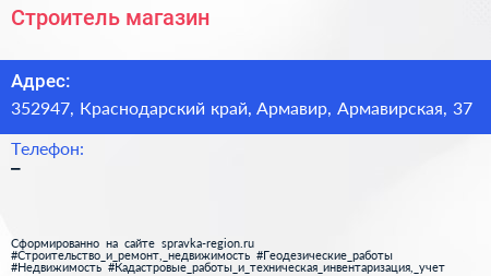 Строитель, магазин по адресу 352947, Краснодарский край, Армавир, Армавирская, 37 в дальнейшем Организация, размещена в следующих категориях: