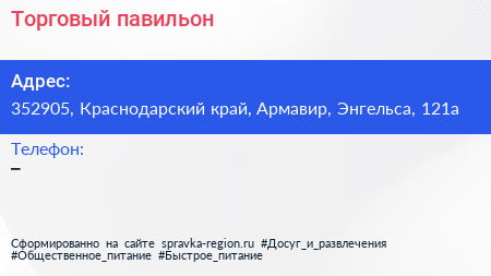 Торговый павильон по адресу 352905, Краснодарский край, Армавир, Энгельса, 121а в дальнейшем Организация, размещена в следующих категориях:
