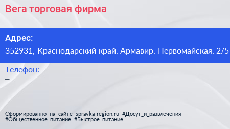 Вега, торговая фирма по адресу 352931, Краснодарский край, Армавир, Первомайская, 2/5 в дальнейшем Организация, размещена в следующих категориях: