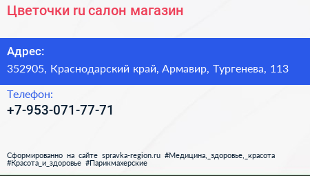 Цветочки.ru, салон-магазин по адресу 352905, Краснодарский край, Армавир, Тургенева, 113 в дальнейшем Организация, размещена в следующих категориях: